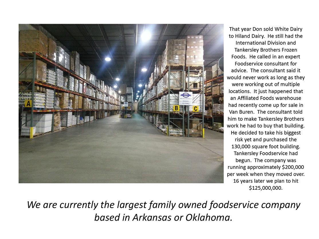 Don grew up in the business and was named president of White Dairy in 1974. In 1998 he sold White Dairy to Hiland Dairy and found himself in a strange position. What was he going to do next? At the time, Tankersley Bros. was still working out of an assortment of outdated facilities in downtown Fort Smith. He knew he needed everything under one roof to make Tankersley work. Oddly enough, the perfect opportunity presented itself just down the road in Van Buren when a grocery distribution center went up for sale. It was then he decided to take the biggest risk of his life and purchase this 125,000 square foot facility.